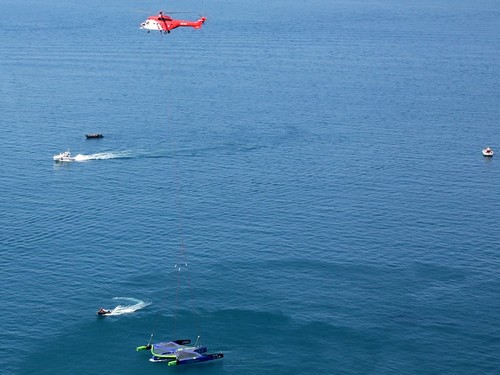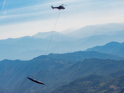 Une opération loin d’être simple : il s’agissait de transporter les trois coques – 15,24 m de longueur, autant de largeur et 2,5 tonnes au peson – depuis Nembro, au nord-est de Bergame (Italie) pour rejoindre la Marina di Carrara, à 10 km au sud-est de La Spezia. A vol d’oiseau, 150 km à parcourir et une chaîne montagneuse à franchir. La vitesse étant (très) limitée, le temps de vol a été estimé à environ trois heures. Un temps de transport important qui, ajouté à la nécessité de s’élever en altitude, a incité Heliswiss International à prévoir un ravitaillement de son hélicoptère AS 332 Super Puma aux pieds des Apennins avant de les franchir.