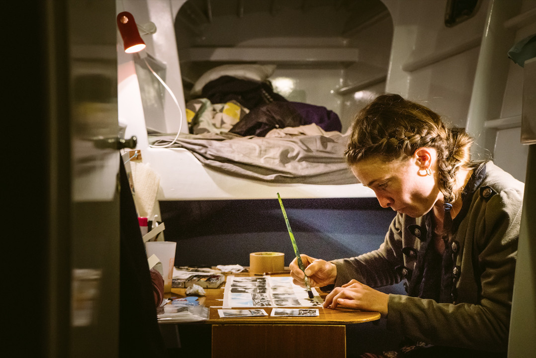 Pour ma part, je suis illustratrice et peintre. Avant d’embarquer sur Honky Tonk, j’ai participé et organisé plusieurs projets artistico-maritimes : l’Armada 2013, qui rassemblait douze voiliers et soixante-dix artistes pour une tournée de deux mois et demi entre la Corse et la Sardaigne ; puis Festina Lente 2016, où trente artistes et marins se sont lancés dans un an et demi de tournée entre la Méditerranée et l’Atlantique nord. Le virus du nomadisme nautique est donc officiellement installé chez notre couple en soif de liberté.