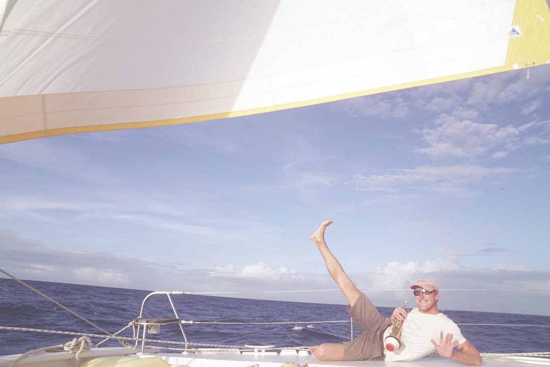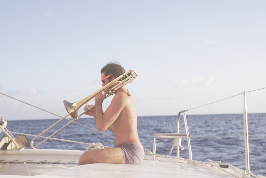 Le soleil des Antilles permet notamment de vivre dehors. Le catamaran et ses surfaces extérieures peuvent être utilisés entièrement, ce qui facilite la vie à bord. En effet, les dix membres de l’équipage se répartissent entre le cockpit, le carré, le pont, les trampolines et l’eau turquoise… on se sent plus à l’aise quand on a de l’espace. Honky Tonk aurait paru bien plus exigu sous des latitudes moins clémentes. C’est d’ailleurs la seule et unique fois que le projet accueillera autant d’artistes, bien que le plaisir de jouer du jazz à autant de musiciens soit immense.