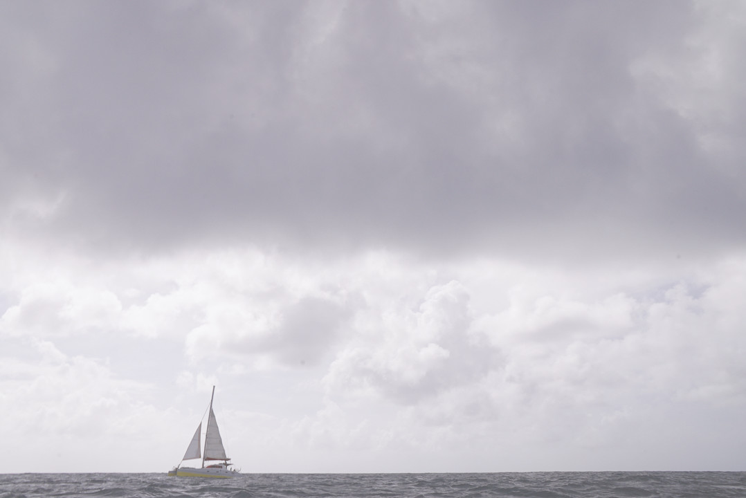 Le capitaine se familiarise avec la navigation en catamaran. Personne à bord n’a jamais réglé les voiles d’un multicoque. C’est toute une expérimentation qui commence : débat à bord avec les équipiers, comparaison et observation des voisins en multi, analyse de la dynamique des fluides dans le nouveau creux de la GV, décorticage de la logique des prises de ris – eh non, il n’y a plus de liston dans l’eau – et découverte de l’anémomètre que personne n’avait jamais utilisé avant. L’équipage s’avère être intéressé et volontaire pour l’apprentissage de la voile. Les conditions sont idéales : 15 nœuds de vent d’est-sud-est régulier et tiède. Parfait pour apprendre en douceur à manœuvrer et à lire le ciel. Des petits grains passent régulièrement, ce qui invite les équipiers à s’investir dans les prises de ris et dans la veille. La mer est tranquille, mais chacun réalise vite qu’il est important d’être alerte, de surveiller comme le lait sur le feu son cap et les nuages. Ce cadre idyllique est immortalisé par Coline, la photographe. Photos qui seront ensuite utilisées pour la diffusion et la communication autour du projet. Tous les musiciens venus à bord par la suite avaient donc en tête les belles images des Caraïbes. Difficile pour eux de s’imaginer sous une grosse veste de quart et les mains dans les moufles. C’est pourtant de ce matériel dont ils auront besoin lors de leur séjour en Irlande ou en Normandie… ! Mais ça, c’est une histoire que vous lirez plus tard.