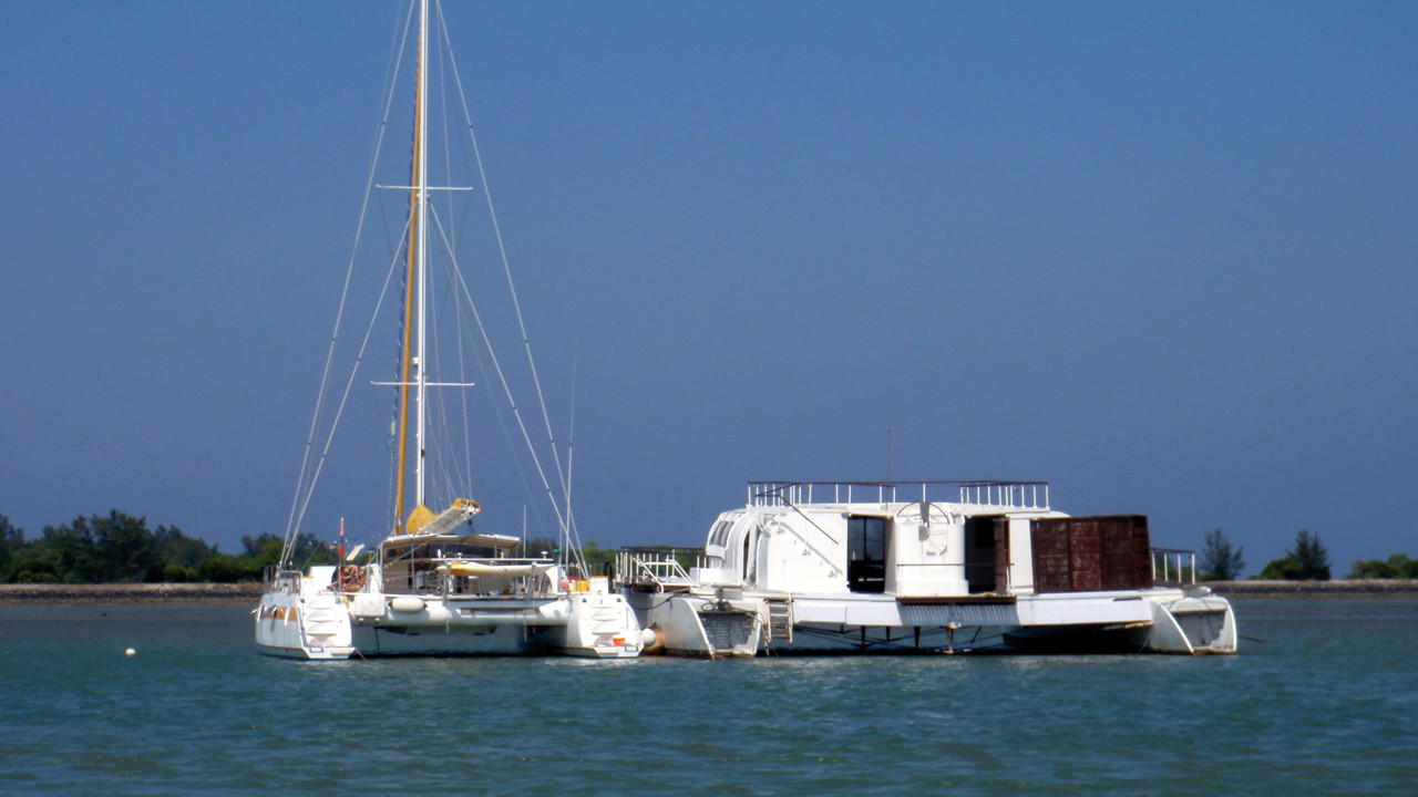 Nous nous faufilons dans la passe, les bancs de corail brisent aussitôt la mer, tout redevient calme. Xavier, qui exploite ici un catamaran Ocean Voyager Fast 62’ construit à Rochefort dans le chantier dont je m’occupais encore il n’y a pas si longtemps, approche avec un Zodiac. Il nous guide jusqu’à une place insolite, à couple d’une épave flottante, un grand catamaran sans mât qui doit être le résultat d’erreurs conjuguées et majeures d’architecture et de construction navales. Un emplacement idéal pour nous, calme et protégé, une annexe géante pour Jangada, que les enfants vont rapidement coloniser…