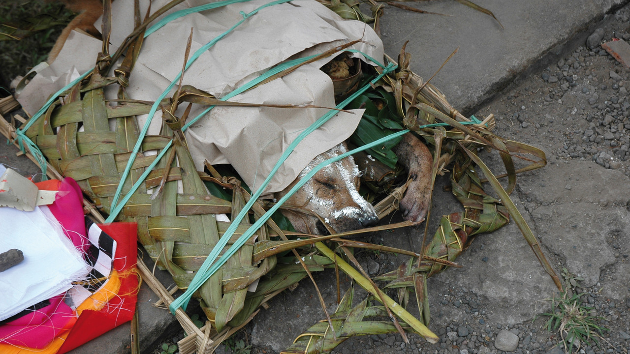 Les sacrifices d’animaux sont sans doute l’aspect qui nous interpelle le plus, nous, Occidentaux. Du chien sacrifié au canard lancé à la mer avec les pattes lestées de petites pierres pour qu’il se noie doucement après avoir lutté pour sa survie, du cochon artistiquement découpé en fines lamelles de lard ornées de piments rouges aux complexes figurines de fruits et légumes, l’hindouisme balinais ne manque pas de surprendre. Entre autres par ses contrastes : d’un côté, un peuple très tolérant, très accueillant, qui vous accepte facilement au milieu de ses rites religieux ; de l’autre, une certaine rudesse qui peut consister à couper la tête d’un canard dans la rue pour aussitôt asperger de son sang les environs de la maison familiale… La religion est omniprésente à Bali, où des temples existent dans chaque village, des autels dans chaque champ. Chaque matin, les Balinais déposent avec ferveur leurs offrandes pour rendre hommage aux bons esprits, et en laissent d’autres ici et là pour apaiser les mauvais. Tous les matins, lorsque nous débarquions sur le ponton, nous étions sûrs de trouver ces jolis petits plateaux d’offrandes, disposés par le gardien de nuit au petit jour. Ce rituel plein de grâce et très esthétique se pratique dans toute l’île. Presque chaque village possède au moins trois temples : le temple le plus important, le pura puseh, est dédié aux fondateurs du village, le pura desa est consacré aux esprits qui protègent la communauté dans la vie quotidienne, et le pura dalem est le temple consacré aux défunts. Les familles honorent leurs ancêtres dans le temple familial, et leur clan dans le temple clanique. Chaque village, chaque clan a son propre calendrier des célébrations, ce qui nous a permis d’assister, à plusieurs reprises, à de nombreux préparatifs et processions dans différents endroits de l’île, dont une cérémonie sur la plage de Tugu, à l’ouest.