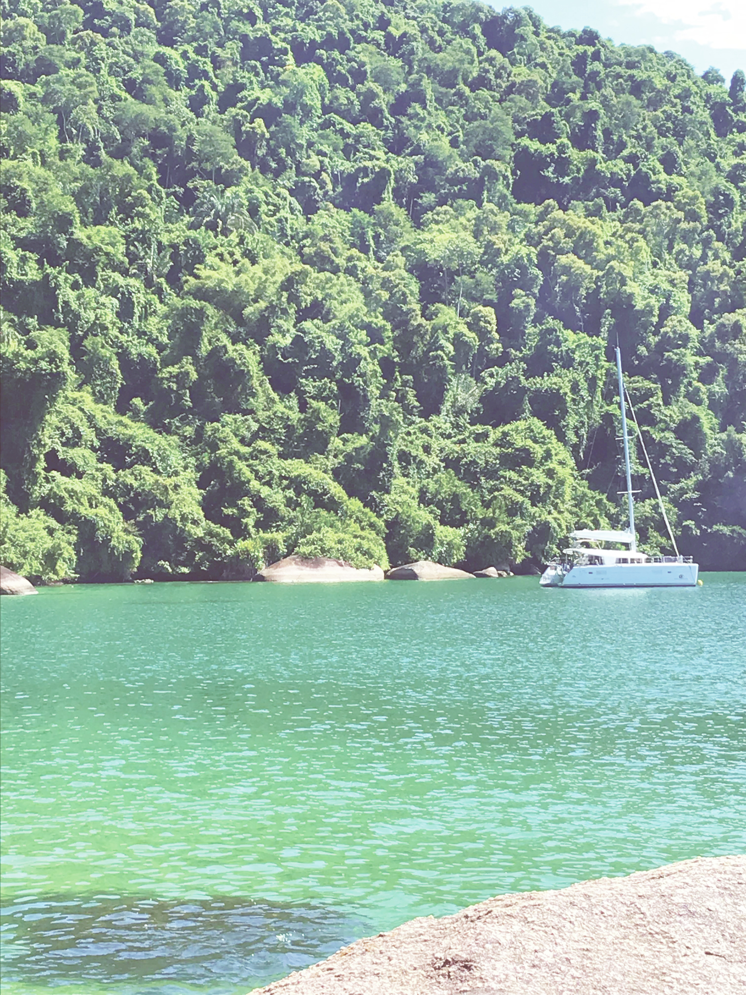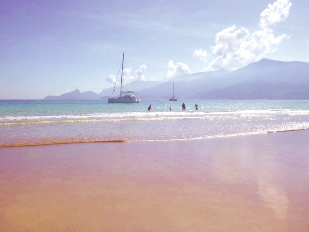 Ensuite, direction Jorge Greco, au sud d’Ilha Grande, un îlot d’une beauté sauvage où nos deux catas sont seuls au monde – avec les oiseaux. Comme les mouillages au sud d’Ilha Grande sont déconseillés la nuit – vent dominant de sud –, nous repartons vers l’est en direction de l’anse Estrela, où un sentier abrupt nous fait découvrir une cascade de 40 mètres avec baignade rafraîchissante à la clé. Nous poursuivons notre périple vers l’anse Sitio Forte, sur la côte nord-ouest. Là, au fond de la baie, le couple qui tient le restaurant Telma nous prépare un dîner les pieds dans le sable. Nous continuons vers Lagoa Verde, côté sud de l’îlot Longa. Un super spot de plongée dans le corail avec des poissons multicolores, raies léopard et tortues vertes. Le soir, nous optons pour la plage d’Aracatiba et son village animé. Notre dernière journée sur Ilha Grande est l’occasion de visiter le village de pêcheurs de Vermelha et celui de Proveta – une grande anse occupée par une population coupée du monde moderne. Le meilleur est pour la fin, avec la plage de Dos Meros, nichée dans une baie aussi splendide que tranquille. Globalement, les mouillages et paysages sont magnifiques dans cette zone. Dommage que l’eau soit souvent souillée de sacs et de bouteilles en plastique…