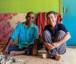 Nous prenons la mer pour Sawa i Lau, un mouillage surtout connu pour ses grottes, qui se visitent avec masque et tuba ; le passage entre les salles se faisant en apnée sur quelques mètres. L’origine volcanique de Sawa i Lau ne fait aucun doute, et son relief est très escarpé en comparaison des îles alentour. L’accès à la grotte se fait par un escalier bâti sur une petite plage non loin d’un ancien cimetière qui nous rappelle ceux des Tonga. Il y fait frais et il s’agit bien d’eau de mer, on repérera une murène, preuve qu’il doit y avoir un accès à la mer quelque part. Le lendemain, nous devons aller rendre visite au village voisin, Nabukeru, et notamment rencontrer le chef pour la cérémonie de bienvenue, le sevu-sevu. Nous préparons notre offrande de yaqona, des racines particulières très prisées qui permettent de préparer cette boisson un peu bizarre pour nous, Occidentaux, et qui en tout cas ne fait pas l’unanimité : le kava. A notre arrivée sur la plage, un habitant nous prend en charge pour nous conduire à la maison du chef. Chapeaux et lunettes ne sont plus de mise par respect pour la tradition. A l’abord de l’entrée, il nous faut scander trois fois « Dua Dua Dua », et le chef nous invite à pénétrer dans la pièce principale. Tout le monde s’assied en tailleur, nous déposons le kava devant le chef, qui prononce dans sa langue un bref discours – que nous supposons de bienvenue. Les habitants s’adressent ensuite à nous en anglais et nous posent tout un cas de questions : d’où venons-nous, bien sûr, quel bateau, etc. Finalement, nous serons exemptés de kava (qui s’en plaindra…) et pourrons ensuite visiter le village. Ils sont tous à peu près organisés de la même manière : au centre, une esplanade délimitée avec des fleurs et pierres ; à l’extrémité, l’église ; et autour, les maisons du village ; un peu plus loin se trouvent parfois l’école et l’infirmerie. Le sol herbeux est très bien entretenu, coupé ras, propre, on y trouve quelques fleurs… et des cocotiers !