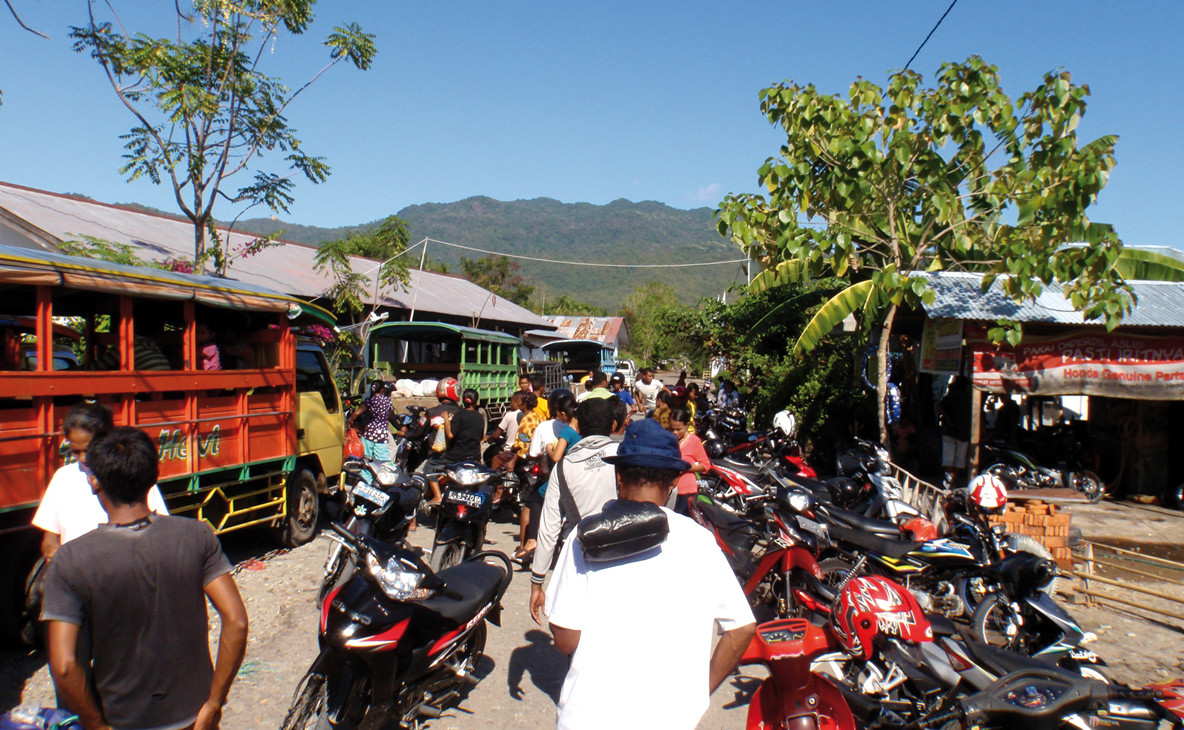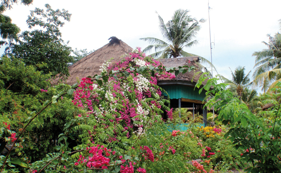 J’ai lu quelque part qu’il existait, à une dizaine de kilomètres à l’est de Maumere, un petit hôtel en bord de plage devant lequel on pouvait mouiller en toute sécurité pour aller visiter la ville principale de Florès et l’intérieur de l’île. Il porte le nom un tantinet ambitieux de Sea World Club, et nous finissons par le dénicher, caché sous les palmes. Nous jetons l’ancre par une trentaine de mètres de fond devant les petites paillotes des bungalows, entourés de magnifiques bougainvilliers. Le Sea World Club est un modeste établissement hôtelier qui comprend un petit club de plongée, un bar de plage et un accès Internet à prix raisonnable, outre un mouillage sécurisé par la présence du personnel local de l’hôtel : exactement ce qui suffit à notre bonheur, nous qui voulons laisser notre voilier au mouillage pour pénétrer à l’intérieur de l’île. Nous nous entassons dans un bemo pour nous rendre à Maumere. La ville n’a pas de charme particulier, mais nous allons sur le port assister au déchargement des goélettes pays. Des câbles de cartahus grincent dans les poulies de mâts de charge, des dockers à la peau sombre actionnent des palans de garde, des treuils à entraînement diesel emplissent l’air de décibels besogneux : les sacs de riz s’entassent dans les cales à destination de Java et Sumatra. Cela me rappelle mon premier métier d’officier de la marine marchande, que j’ai aimé ! Nous déjeunons dans un warong du port, à côté de dockers et de douaniers en uniforme. Nous dénichons le pasar, le marché aux fruits, légumes, viandes et poissons, particulièrement odorant, mais bien achalandé. Je confesse volontiers que c’est une de mes activités préférées en voyage : déambuler sur les marchés locaux. Cela permet de se faire rapidement une idée du niveau de vie local, de la richesse du pays, et de sentir l’âme d’un peuple. En quelques minutes, on y appréhende beaucoup de choses. J’adore.