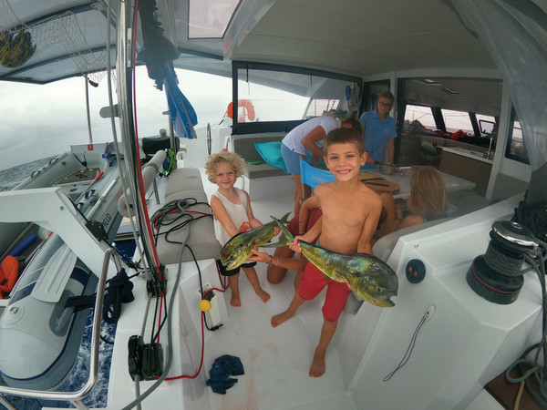 C’est parti pour mon quart. Sortir dehors, s’attacher, observer les étoiles, les vagues, l’écume qui blanchit dans la nuit ; surtout les nuits sans lune où l’obscurité profonde est presque effrayante. Vite, rentrer, se caler pour lire quelques pages, s’assoupir, se réveiller, refaire un tour, se poser, écrire le livre de bord, étudier la route, se rendormir, se réveiller, régler les voiles dans ce vent d’est qui nous pousse vers le nord. Le cap me conduit vers Cuba, la Floride, les Bermudes, et de temps en temps Montréal. Les vagues s’amusent avec le bateau. Pour lutter contre le sommeil, je commence un pain, dans la pénombre et sans faire de bruit, à la lueur d’une lampe de poche ; il est 4h, l’heure du boulanger, non ? Je lis de nouveau pour m’endormir, sors prendre l’air, scrute l’horizon : rien, personne, pas de lumière. Juste les vagues, l’écume, les étoiles, le vent et le plancton fluorescent. Au petit matin, les enfants sortent un par un de leur cabine, ajoutant leurs rires et leurs jeux, effaçant le calme de la nuit. La journée passe vite, entre la préparation des repas, des gâteaux, les siestes et les jeux interrompus par la canne qui se décide à nous offrir une belle daurade coryphène. Cela fait déjà une semaine que nous sommes partis. En vue de notre « confinement » sur l’Atlantique, nous avons dévalisé tout le Cap-Vert de ses œufs et de sa farine, pour pouvoir tenir. Ici, le pain est bon. Mais, avant de le déguster, il faut de bon matin récolter tous les poissons volants qui ont atterri sur le pont et le trampoline. Et puis il y a l’école à bord, c’est comme l’école à la maison : un enfant en culotte qui colorie un sapin de Noël par 28°C, le second en pyjama fait de la géométrie par 3 mètres de houle, le troisième, habillé, a l’air à peu près concentré. Quant au quatrième, il a décrété qu’il ne voulait pas travailler, mais il a quand même compris que ça serait bien de savoir lire pour déchiffrer les noms des bateaux copains à l’AIS. Au moins, il saura naviguer. On se régale, comprenez : daurade au four, daurade en brandade, daurade en lasagnes, pâtes à la daurade, rillettes de daurade. Et pour varier, on refait les mêmes, mais à la bonite.