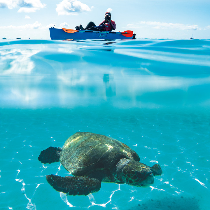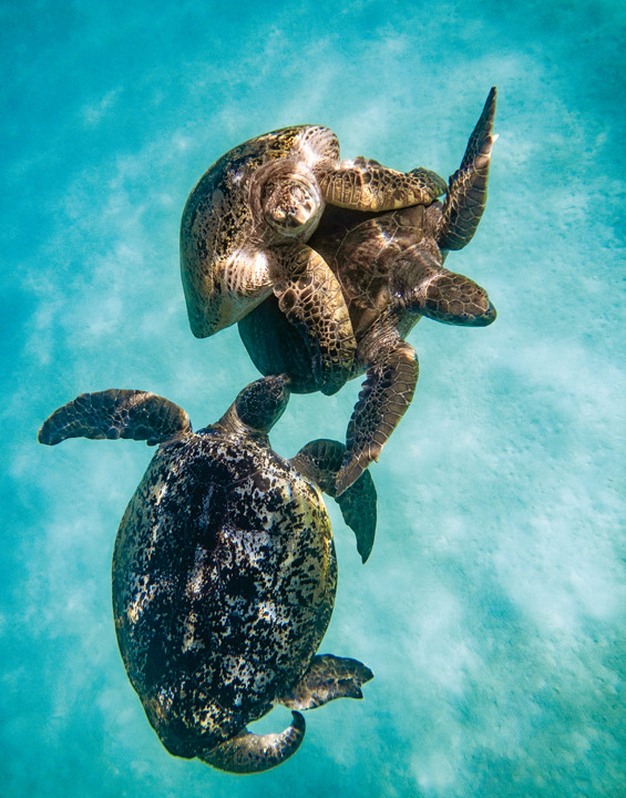 L’effrayante tranchée traversée, nous apercevons en surface des coquilles mouvantes. Il n’est pas évident de distinguer l’ofni, mais, en se rapprochant, deux tortues s’accouplant apparaissent dans le viseur de l’appareil photo. Il s’avérera que l’atoll en est rempli, des centaines en pleine période de reproduction dans une eau cristalline.