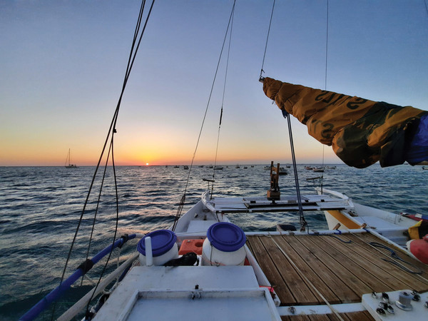 Notre première destination a été les Baléares. Nous avons profité avec délice des criques désertes et de la mer au bleu intense. En raison de la Covid, les contacts avec les gens se sont avérés difficiles, mais nous avons cependant fait de belles rencontres, notamment à Puerto Soller, sur l’île de Majorque. A Formentera, grâce à notre faible tirant d’eau de 50 cm, nous avons échappé à un fort coup de vent en nous réfugiant dans une lagune fermée, dans laquelle seules les barques de pêche et les jolies majorquines pénètrent. Ensuite, plusieurs journées de navigation intenses se sont enchaînées. Profitant de chaque fenêtre météo, nous avons accumulé les milles, nous relayant à la barre jour et nuit, car nous n’avons pas de pilote automatique, et le vent était bien trop changeant pour le régulateur d’allure. En approchant de Gibraltar, nous avons remonté une file interminable de cargos au mouillage. Pendant trois jours, le vent s’est fait attendre, puis soudain le Levante s’est levé, avec force, avec de violentes rafales, nous obligeant à affaler en urgence. A sec de toile, nous avancions encore à 4 nœuds. Ça a duré quelques dizaines de minutes, puis plus rien. Le vent a disparu, nous laissant ballottés par des vagues cassantes. Nous avons alors hissé de nouveau les voiles et, dix minutes plus tard, le vent était de retour, avec la même puissance… avant de disparaître de nouveau. Nous avons passé ainsi toute la nuit à manœuvrer, hissant et affalant sans arrêt les voiles. Au matin, épuisés, nous avons mouillé l’ancre au pied du fameux rocher. Deux jours plus tard, le détroit de Gibraltar était dans notre sillage. Heureux d’avoir pu tester le bateau dans de grosses conditions, nous avons fait halte pour quelques jours dans la belle cité de Cadix. Nous sommes alors partis nous abriter d’un coup de vent plus en amont sur la Guadiana, qui marque la frontière entre l’Espagne et le Portugal. Et c’est en haut de cette rivière, dans le petit village perché de Mertola, que nous avons fêté nos mille premiers milles, en compagnie d’une horde de motards portugais, sur un air de fado.