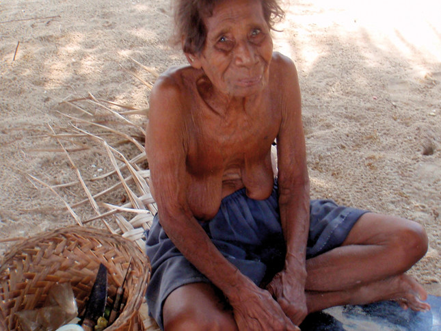 Voilà notre premier Papou qui approche dans sa petite pirogue à balancier, la pagaie à la main. Il a l’air gentil, mâche du bétel, ce qui lui fait une bouche ensanglantée vraiment rassurante, et parle quelques mots d’anglais : c’est John, le chef du village, un petit gabarit aux yeux malicieux. Il fait connaissance avec nous, prudemment, ne s’impose pas, mais on le sent curieux. Il est venu voir qui arrivait dans son île. Les contacts humains aux Louisiades seront comme ça, empreints de réserve, plus distants qu’au Vanuatu. La langue est aussi un problème, l’anglais est moins parlé que les dialectes locaux. Nous indiquons à John que nous irons visiter son village quand le soleil sera un peu moins haut. En attendant, il nous indique que nous pouvons nous baigner dans la baie, il y a bien sûr quelques requins, mais généralement non agressifs, et pas de crocodiles à Nimoa, où il n’y a pas de mangrove. Bonne nouvelle. Plus tard, nous débarquons sur la petite plage. Tous les villageois nous observent. Nous ne ressentons pas d’agressivité, non, aucune, c’est simplement qu’il existe un monde de différences entre eux et nous, entre leur civilisation, leur mode de vie, leur niveau de développement, et les nôtres. Et chacun le sait. John nous présente sa femme, qui nous adresse un grand sourire également rouge sang de bétel, moyennement sexy, on va dire, et ses fils, qui travaillent, avec d’autres jeunes garçons, à remettre en état une grande pirogue à voile tirée sur des rondins de bois devant les cases. Les enfants sont nombreux, mais eux aussi sont réservés. Ils ont facilement peur de nous. Un geste un peu brusque, et les voilà qui détalent. Les cases ici sont toutes surélevées, et il doit faire bon y dormir, à même les nattes, dans le souffle de l’alizé. Des petites cases séparées servent de cuisine à proximité des cases d’habitation. On y retrouve la panoplie habituelle des gamelles en fer blanc et des bouilloires noircies de fumée, accompagnées d’ustensiles taillés dans le bois. Les coutelas et les machettes sont nombreux, les hommes en ont toujours un avec eux, dont ils se servent tout le temps, et pour tout faire. Les Papous utilisent beaucoup les fibres végétales de la forêt, qui leur servent à réaliser les ligatures utilisées couramment dans leur vie quotidienne, pour leurs habitations, leurs embarcations, leurs cultures.