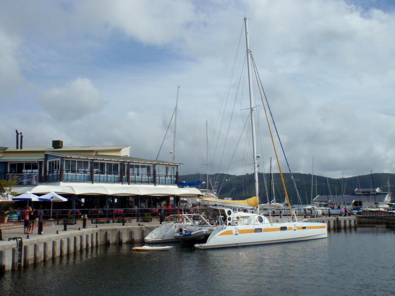 Une station du National Sea Rescue Institute sud-africain est installée à proximité et peut donner des informations sur l’état du goulet. Dans notre cas, je suis optimiste, la houle de sud-ouest est relativement faible, le vent de sud-est tombé à 10 nœuds, et nous nous présentons en fin de marée montante par un coefficient moyen, tous les feux sont au vert ! Ceci dit, je ne connais pas l’endroit. Nous affalons à un mille de l’entrée, faisons chauffer les moteurs, et nous dirigeons vers les Heads, en cherchant les deux feux d’alignement au 006°. Comme d’habitude lorsque nous avons à franchir un passage délicat, j’ai la carte bien en tête, pour l’avoir attentivement étudiée à plusieurs reprises dans les heures précédant l’arrivée. Lorsqu’on est ensuite en situation, les choses peuvent s’enchaîner assez vite, mieux vaut alors avoir le schéma des lieux imprimé dans son logiciel personnel, et avoir imaginé les solutions de dégagement les plus sûres. Nous sommes en début de saison touristique, et quelques dizaines de personnes se sont massées sur les abords d’Eastern Head pour assister à notre entrée. Comme d’habitude aussi, les rôles ont été répartis : Adélie est au sondeur et annonce le fond toutes les 10 secondes. Marin veille aux jumelles, prêt à prendre les commandes si j’ai besoin de les quitter momentanément, ma compagne est devant l’ordinateur de navigation, et je suis à la barre. Tout se passe bien, le courant rentrant nous entraîne à l’intérieur, et nous débouchons dans la lagune de Knysna. Aucune difficulté cette fois. Le calme de ce lieu bien protégé du large nous accueille dans une belle lumière de fin d’après-midi. Nous constatons que la mauvaise réputation de la barre des Heads incite les voiliers de passage à continuer leur route vers Mossel Bay, False Bay, ou Cape Town : très peu de voiliers en escale ici. Cela se révèle une sacrée bonne idée d’arriver au Club à l’heure de la bière du soir, et d’y faire le spectacle, car de nombreux membres s’y retrouvent à ce moment agréable du début de soirée. Nous passerons la première nuit au ponton du club, et le lendemain matin, le capitaine du port nous autorisera à nous mettre à quai en plein Waterfront, à quelques mètres des restaurants et des boutiques de cette ville agréable. En attendant, après 3 jours de mer mouvementés depuis Richards Bay, nous débarquons, montons le petit escalier de bois de la terrasse du Yacht-Club, et savourons devant la lagune de Knysna une Black Label bien fraîche…
