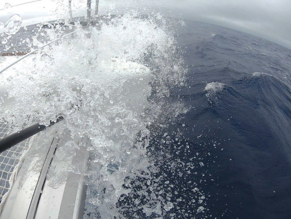 12 mars et fin de la deuxième dépression dans la face. Je peux vous assurer que ça a dépoté, encore une fois ! Je revois encore mon père avec son pot de graines ; il les prenait une par une et les mâchait sans réfléchir, stressé à bloc car on venait de passer tous les deux la nuit sans dormir avec du 45/50 nœuds de vent établi et une houle avec des creux de 8 à 10 mètres. Pour ne rien arranger, un grain énorme est venu s’ajouter au tableau au lever du jour. Quand on a vu ce truc avancer vers nous, alors qu’on se tapait déjà un gros coup de vent, autant vous dire que l’on ne savait pas du tout à quoi s’attendre. Que pouvait-il nous amener, ce foutu grain ? 70 nœuds, 80 ? Une fine pluie a commencé à tomber et le grain mystérieux était toujours visible au loin. Avec mon père, après cette longue nuit blanche agitée à veiller sur Maitai, on se regardait avec une belle complicité ; on attendait le verdict et la sanction du temps, sans pouvoir rien faire… puis bizarrement, le vent a semblé se calmer et baisser, un brouillard s’est levé et la houle a diminué, petit à petit… L’océan paraissait retrouver son calme et laisser en arrière sa mer déchaînée. Ouf !