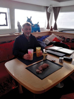Et qui dit bien manger dit bien boire ; il fallait bien nous détendre un peu après toutes ces intempéries. On a sorti le rouge et le rhum, et passé un après-midi jeux et rigolades sur un océan tout calme : un moment magique !