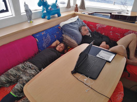 Le rituel père/fille après une tempête et une nuit blanche : Ricard et saucisson au petit matin, puis repos dans le carré.
