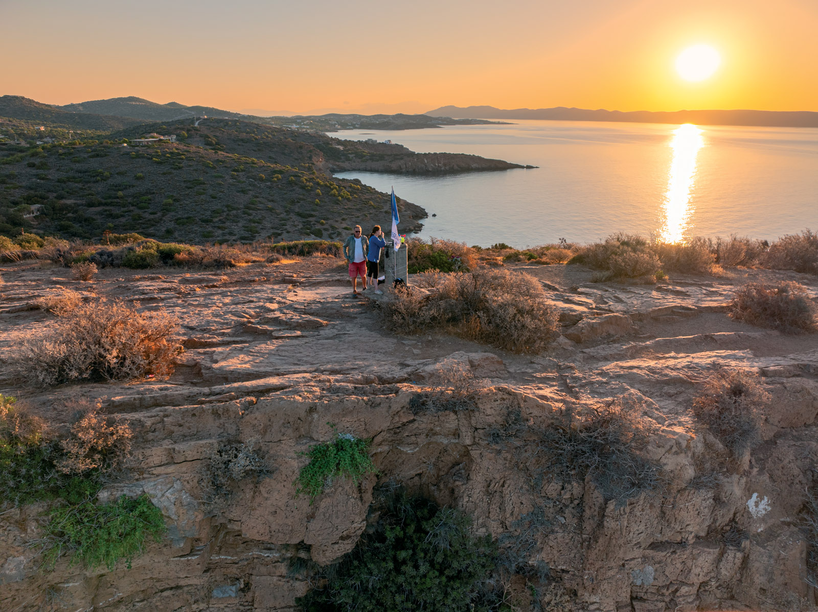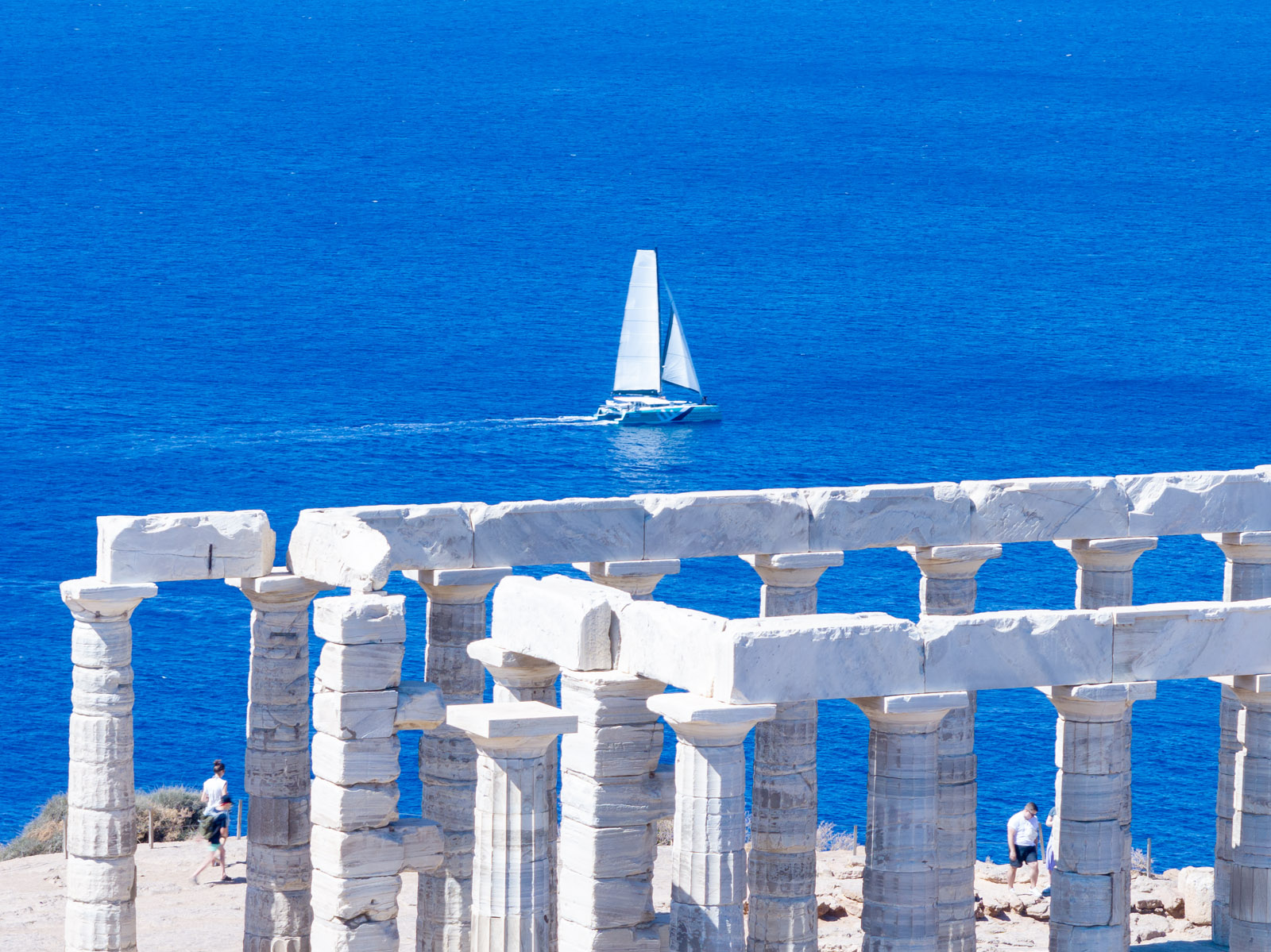 Au moment du départ, il y a une quinzaine de nœuds sur la zone de course, avec une bouée de dégagement mouillée sous le temple de Poséidon, juché en haut des falaises de Sounio : difficile d’imaginer un plus beau cadre pour le début de course des 60 concurrents…