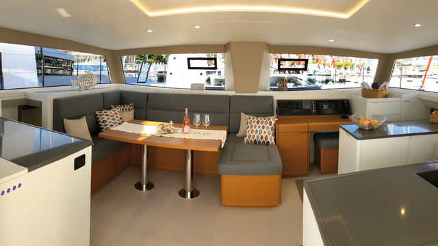 Comme c'est maintenant de coutume, le nouveau catamaran Fountaine Pajot est pour l'instant connu sous son nom de code "New 45". Il remplace dans la gamme l'Hélia 44, et le New 45 reprend les codes des derniers-nés du chantier (Lucia et Astréa). A son bord, on découvre un volume impressionnant, baigné de lumière et particulièrement agréable à vivre. Le nouveau poste de barre est à la fois convivial – il est proche du cockpit, mais aussi de l'espace baptisé Lounge Deck que l'on trouve sur le toit du roof – et pratique avec toutes les manœuvres à portée de main. Le cockpit avant est aussi un bel espace confortable qui devrait être plébiscité au mouillage. Enfin, on retrouve la véritable "plage" (en option) qu'offre la plate-forme hydraulique arrière.