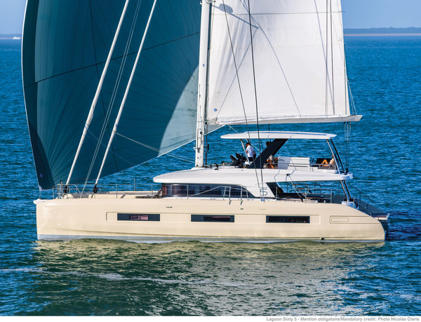 On l’attendait en avril à La Grande Motte… ce sera en septembre à Cannes, si tout va bien. Le lancement du Lagoon SIXTY 5 a bien sûr été perturbé par la crise sanitaire. En attendant le Cannes Yachting Festival millésime 2020, nous voilà à bord de cet imposant catamaran de plus de 20 mètres. Une fois n’est pas coutume, la base de ce modèle est la version power, et non l’inverse. Lagoon était désireux de compléter d’abord son offre moteur sur ce créneau en forte croissance. Le SIXTY 5 est donc la déclinaison voile du SIXTY 7 présenté il y a à peine un an – voir essai dans MM199. Notre nouveauté reprend le design des grands Lagoon et conserve le rouf a effet suspendu et « l’oreille » découpée en haut des montants arrière. Les coques rouge bourgogne du premier modèle optent cette fois pour un crème plus discret. Mais la différence la plus visible est bien sûr l’imposant gréement. En revanche, le travail réalisé sur le tiers arrière des coques, des safrans et des quillons – le tirant d’eau est supérieur de 40 cm – est forcément plus discret.