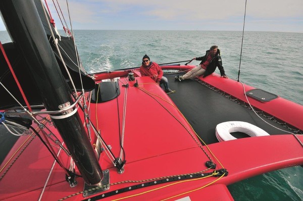 Ce trimaran bodybuildé n'a laissé personne insensible sur les pontons de La Grande Motte 2019 ; le Libertist est beau ! Le dessin des bras est une réussite. Leur forme harmonieuse tout comme l’état de surface impeccable du composite participent à la séduction immédiate. Le principe d'assemblage est intelligent : les bras sont encastrés dans une réservation du pont et solidement boulonnés, tout comme leurs liaisons avec les flotteurs. Ces derniers affichent un volume important associé à des entrées d'eau affûtées. On remarque également deux petits foils fixes en carbone. La coque centrale est un véritable exercice de style : les lignes filent magnifiquement, les proportions sont habiles, et l'étrave (droite) ne cède à aucune mode passagère. Les œuvres vives tendues traduisent le potentiel de performances, mais l'ergonomie du pont, des bras, des trampolines est agréable et compatible avec la croisière familiale. Le cockpit est confortable et sécurisant.