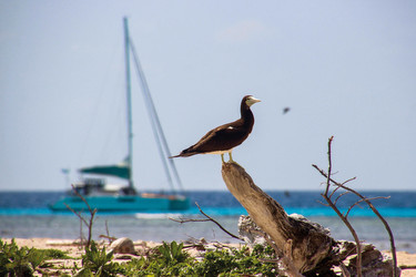 Le mouillage est rouleur, mais que le paysage est beau ! La biodiversité nous rappelle les Chagos, au milieu de l’océan Indien. Comme là-bas, les animaux n’ont aucunement peur de nous, ils sont plutôt curieux et semblent à peine s’interroger quant à notre présence. Toute une communauté d’oiseaux de mer niche sur ces quelques mètres carrés de terre ; des fous, des frégates et des plus petits dont je ne connais pas le nom. L’intérieur de l’île étant interdit d’accès afin de préserver les espèces, nous observons depuis le pourtour sableux. La végétation n’est pas extrêmement dense, elle paraît toutefois suffire à la peuplade de volatiles qui a l’air de s’être réparti la zone en fonction des besoins de chacun. Les plus remarquables sont les fous, en nombre bien plus important que les autres. Pas moins d’un nid tous les mètres abrite la progéniture de ces sulidés. Certains petits sont encore à l’état d’œufs, d’autres au stade de craquants oisillons. Les plus drôles sont les juvéniles. Pas encore adultes, ils dépassent leur mère d’une tête et s’égosillent dans leur ramage en pleine mue ; ils se comportent comme de jeunes pubères... Sous l’eau, la diversité d’espèces est étonnante, et la grosseur des poissons saisissante. Les perroquets d’un turquoise intense ont une chair généreuse, les loches atteignent des tailles démesurées, les carangues sont gigantesques.