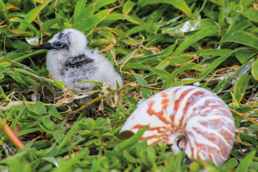 Chaque excursion à l’extérieur du catamaran nous apportant sa dose de prises de vue, nous ne sortons jamais sans nos figeurs d’images. Nous sommes maintenant aux abords de l’îlot Huon. A l’instar de notre précédent mouillage, le courant important se concilie mal avec l’ancrage tranquille. Les vaguelettes viennent taper le flan tribord de Black Lion, faisant balancer son mât d’un côté à l’autre. Un tel roulis nous aurait sans doute délogés en un autre lieu… mais être ici est bien un privilège. Dès lors que nous sommes certains que notre pioche est bien cramponnée au fond, j’aime laisser vaga- bonder mon esprit et imaginer les extraordinaires découvertes que nous allons faire. Les versants au vent sont très souvent jonchés de tout ce que l’océan ne veut plus. Mis à part toutes les brosses à dents, claquettes, et autres objets polluants humain, cette fois-ci, de minuscules nautiles seront notre trésor. Plus au centre de l’île, de grosses tortues ont choisi de rendre ici leur dernier souffle. Leurs carcasses blanchies par le soleil reposent au milieu des bernard-l’hermites et d’un parterre semblable à du gazon. Autour, le sable écru et les récifs bruns découverts par marée basse donnent encore plus d’éclat aux couleurs du lagon. L’isolement est parfait, il peut se passer (presque) n’importe quoi dans le monde sans influencer le bon déroulement de la vie ici. Mais l’exclusivité qui nous est accordée dans cette thébaïde va devoir se partager, un yacht de vingt mètres entre dans notre champ de vision – puis dans le lagon. Egoïstement, nous aimerions garder ce shambala (« lieu du bonheur paisible » en sanskrit, NDLR) rien que pour nous ! Au lieu de ça, nous laissons la place en prenant la direction des Chesterfields…