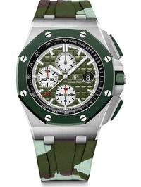 Created in 1993, the Audemars Piguet Royal Oak Offshore chronograph undeniably gains in virility with this steel variation on a rubber strap with a camouflage motif. Water-resistant to 100 meters (330’), the 44 mm-diameter case features an octagonal bezel, push-pieces and a ceramic crown, a high-tech material that is unalterable, very light and extremely resistant to wear and tear.