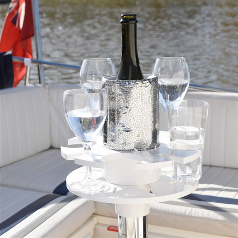 Voilà un équipement qui pourrait bien devenir un incontournable de la navigation ! Ce Boat Bar proposé par le jeune équipementier britannique Marine Innovations (lancé en 2023) peut contenir en toute sécurité jusqu'à quatre verres à champagne ou à vin, plus quatre bouteilles de bière, canettes ou gobelets ; il dispose également d'un port central pour une bouteille de vin ou de champagne.