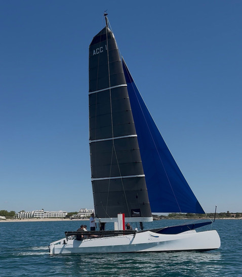 Ce multicoque tout carbone de 10 mètres de long et de 9 de large – avec ses échelles – pèse à peine une tonne. Avec ses élégantes étraves canoë, il ne manque pas d’allure mais ce n’est pas son dessin qui doit retenir l’attention… on monte plutôt un peu le regard pour découvrir un mât carbone de 17 mètres qui supporte une étonnante une aile souple et épaisse de 60 m2 baptisée ACCWing (pour automatic camber control wing). Le principe est donc de disposer à volonté, suivant l’allure et la force du vent, d’un profil simple ou cambré, à la manière d’une aile d’avion. La similitude avec les aéronefs modernes ne s’arrête pas là puisque le système s’actionne automatiquement grâce à des « muscles » souples internes. Sur l’eau, l’engin file à plus de 9 nœuds avec seulement 11 nœuds de vent… le tout avec une grande tolérance de réglage.
