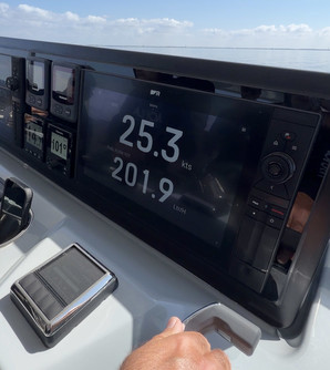 Dans cette configuration, le 50 Yacht s’engage sur son foil dès 2 500 t/m. A partir de ce régime, la vitesse établie à 17/18 nœuds croît très vite si on pousse encore les gaz – on atteint 21,7 nœuds à 2 750 tours. A cette vitesse, la consommation est de 165 l/h, une valeur inférieure de 20% à celle qu’on observait avec le régime max des 380 ch. Par mer plate, on observe que les bulbes sont sensiblement émergés – en tout cas plus qu’avec la version sans foil. A fond, soit 3 065 t/m, nous sommes bien parvenus à dépasser les 25 nœuds comme le souhaitait le constructeur en conservant une stabilité remarquable.