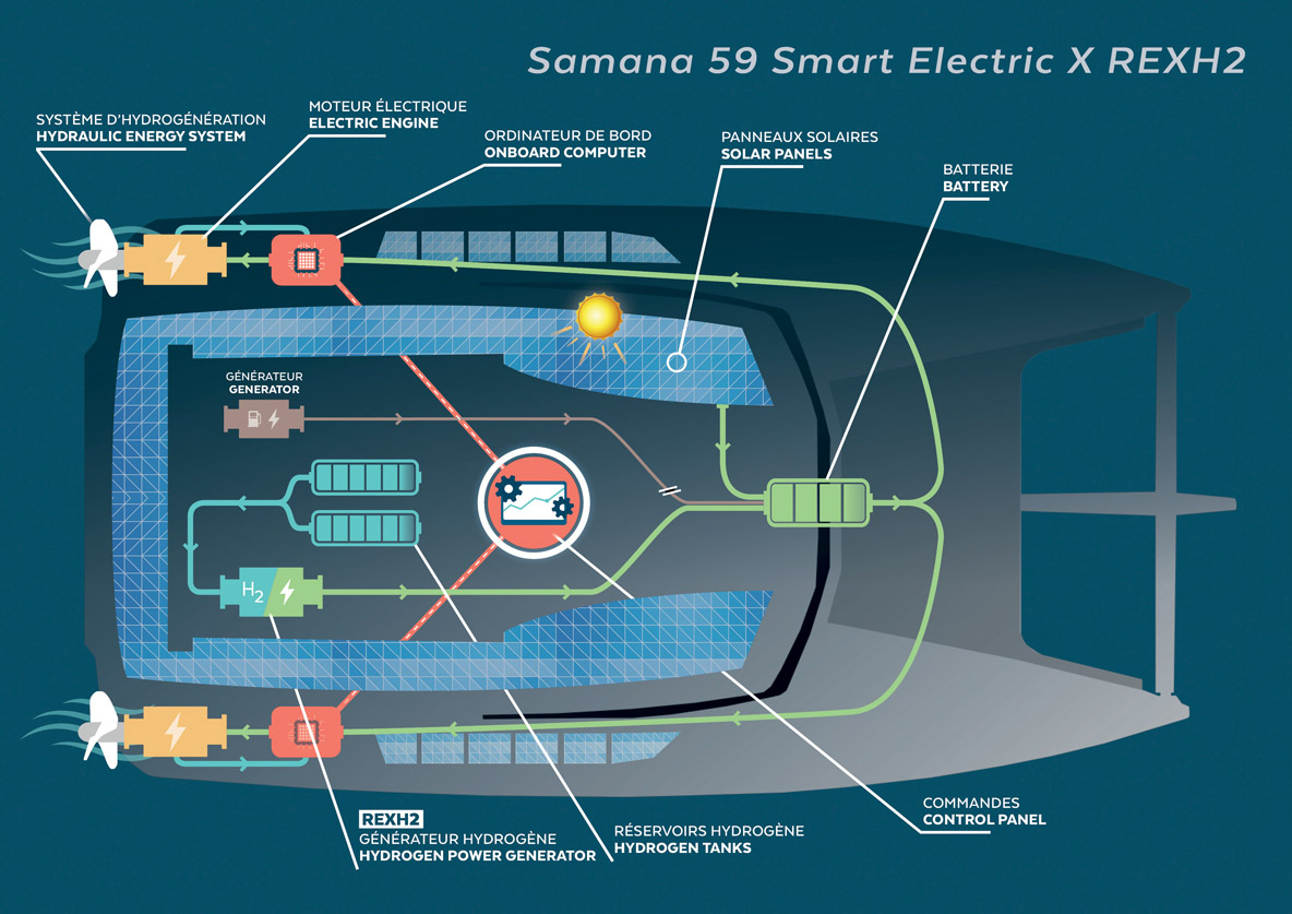 Pour la première fois, un bateau de plaisance équipé d’une pile à combustible est à l’eau ! A partir d’un Samana 59 standard, les équipes de Fountaine Pajot et d’EODev ont mis au point et installé un groupe électro- hydrogène d’une puissance nominale de 70 kW.